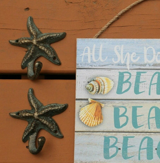 Wood Beach Sign / Starfish Wall Hooks Beach House Decor Set, Sea Soul