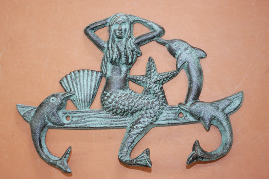(5) Antiqued-look Mermaid Wall Decor, Cast Iron Wall Hooks, Sea Fab Five